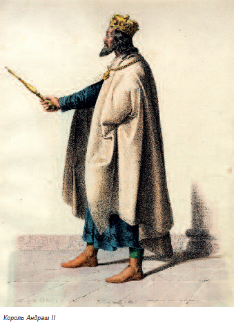 Младший сын Белы III Андраш (Андрей) II продолжал активную, экспансионистскую политику отца. Он был первым и единственным венгерским правителем, который в 1217 году принял участие в одном из крестовых походов на Святую Землю. Во внутренней политике стремился к созданию преданной ему аристократической прослойки, поэтому раздарил своим сторонникам большую часть королевских владений. В годы его правления началось формирование венгерского сословного государства, о чём свидетельствует издание в 1222 году Золотой буллы (через семь лет после английской Магны Карты). В этой грамоте король обещал положить конец чрезмерному раздаренною имений и вовлечь в управление государством и массы дворянства. Наиболее важное часто упоминаемое главным образом во время сословных восстаний XVII века - положение Золотой буллы обеспечивало жителям страны (то есть наделённому политическими правами дворянству) возможность для выступления против незаконных королевских распоряжений. Венгерские сословия отказались от «оговорки о восстании» лишь в 1687 году.